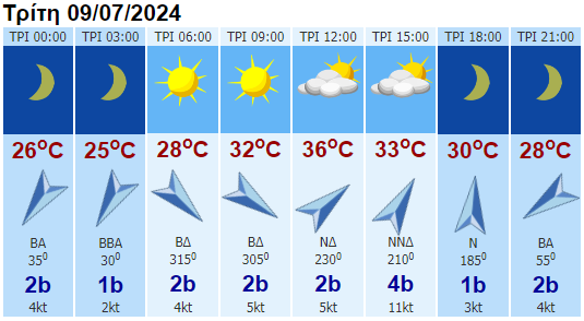 Θερμοκρασία: Από 19 έως 38 βαθμούς Κελσίου. Στη δυτική θα είναι Μακεδονία 3 με 4 βαθμούς χαμηλότερη.