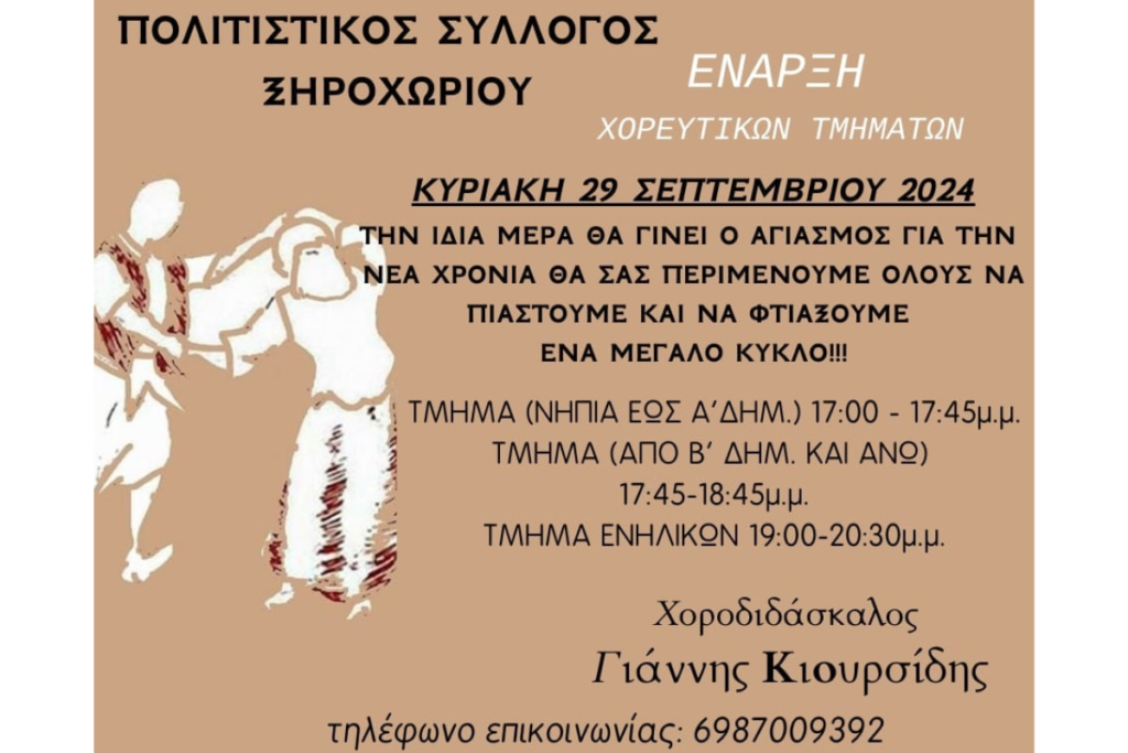 Ο αγιασμός της νέας χορευτικής χρονιάς θα πραγματοποιηθεί την Κυριακή 29 Σεπτεμβρίου στις 17:00μ.μ. στον χώρο του νηπιαγωγειου. Την ίδια μέρα θα γίνονται κ οι εγγραφές των χορευτικών τμημάτων“