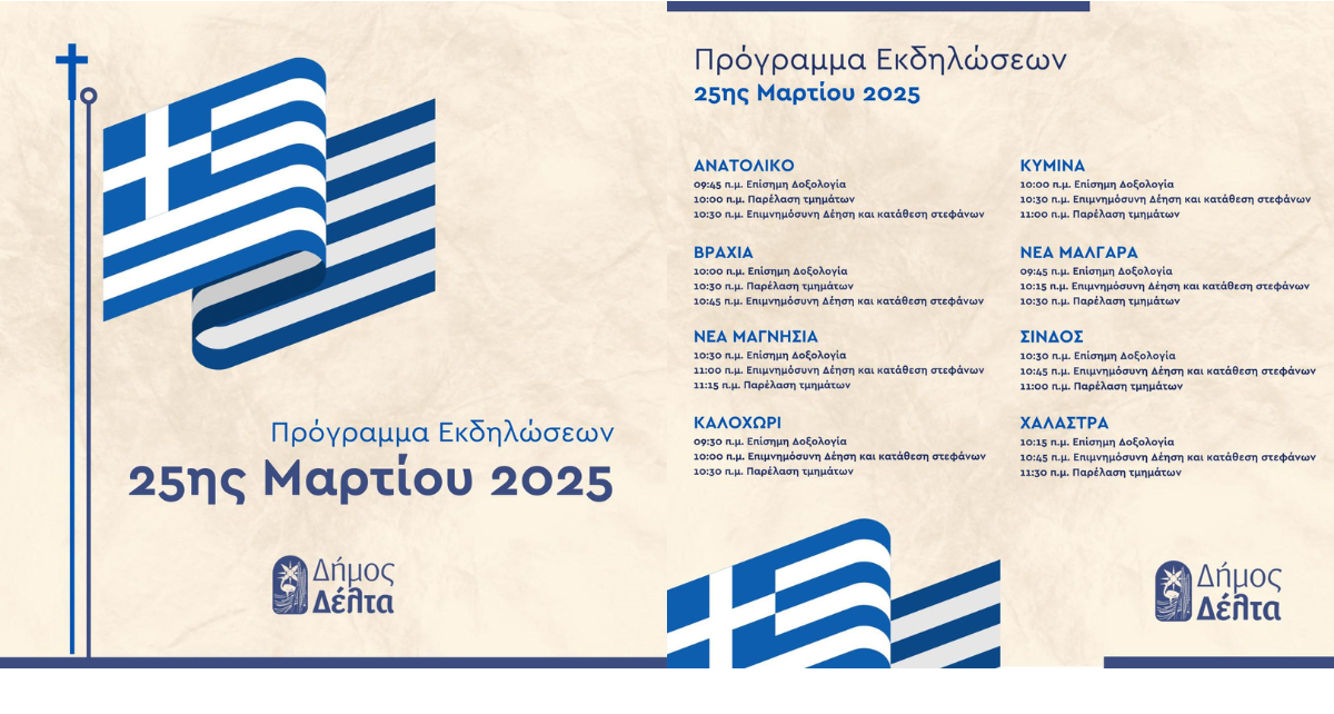 Πρόγραμμα Εκδηλώσεων 25ης Μαρτίου 2025 στον Δήμο Δέλτα