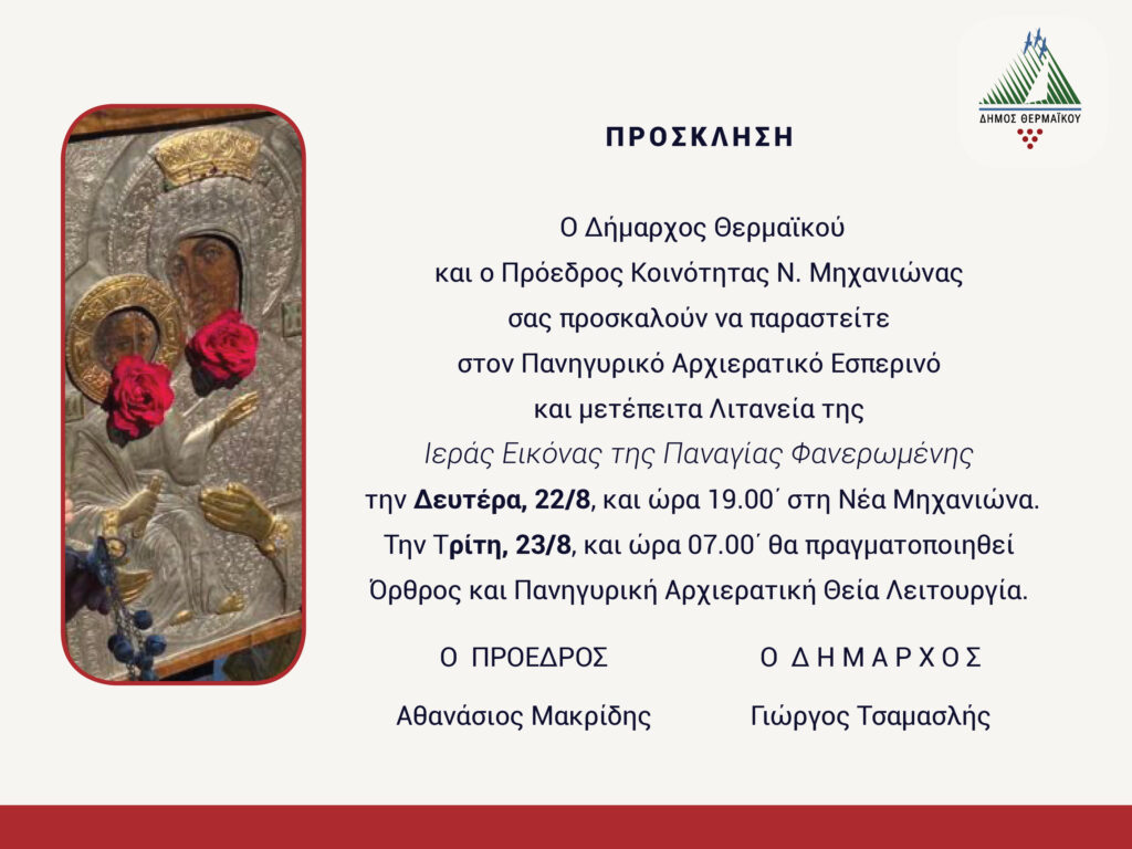 Ο Δήμαρχος Θερμαϊκού, Γιώργος Τσαμασλής και ο Πρόεδρος Κοινότητας Ν. Μηχανιώνας Μακρίδης Αθανάσιος, σας προσκαλούν να παραστείτε στον Πανηγυρικό Αρχιερατικό Εσπερινό και μετέπειτα Λιτανεία της Ιεράς Εικόνας της Παναγίας Φανερωμένης την Δευτέρα 22/8, και ώρα 19.00 στην Νέα Μηχανιώνα.