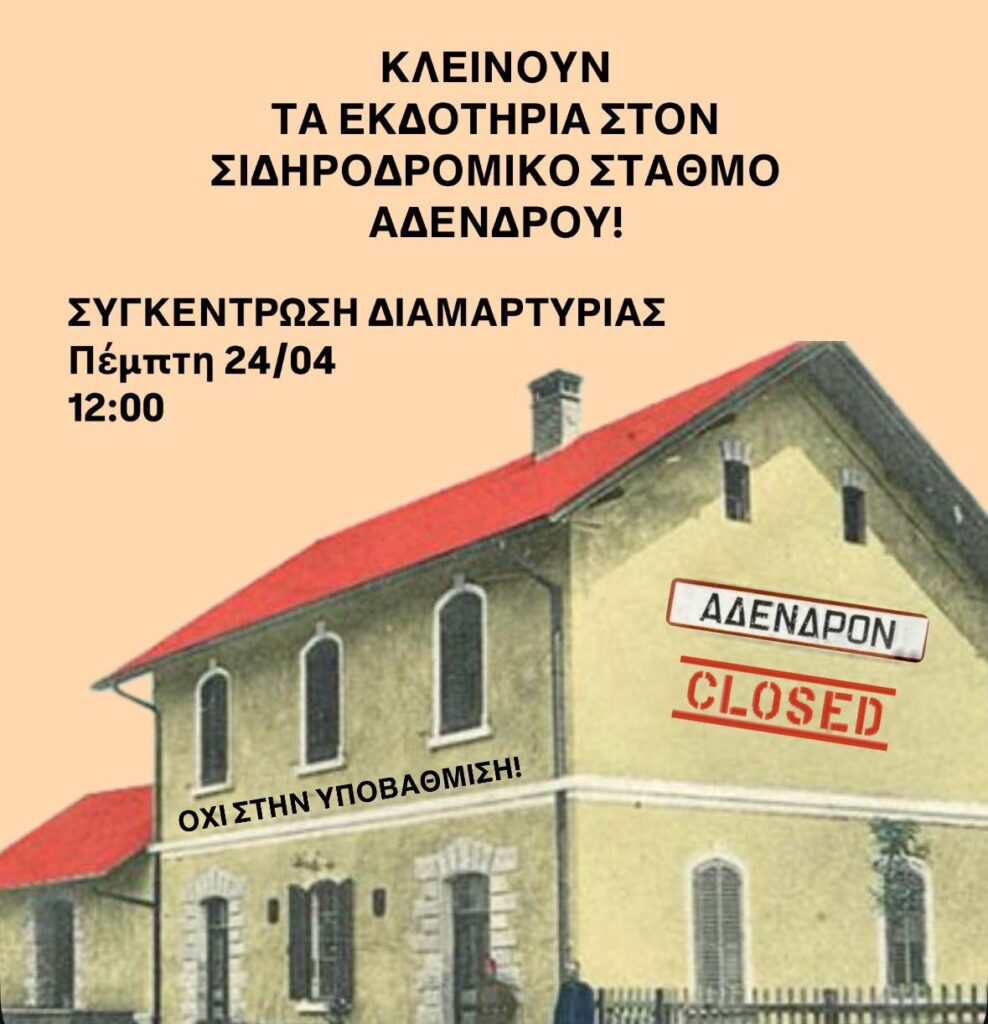 Η παράταξή μας εκφράζει την έντονη διαμαρτυρία της για το αιφνιδιαστικό κλείσιμο των εκδοτηρίων στον Σιδηροδρομικό Σταθμό Άδενδρου, μία απόφαση που πλήττει άμεσα την καθημερινότητα των κατοίκων της περιοχής και των επισκεπτών της.