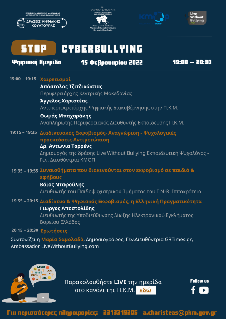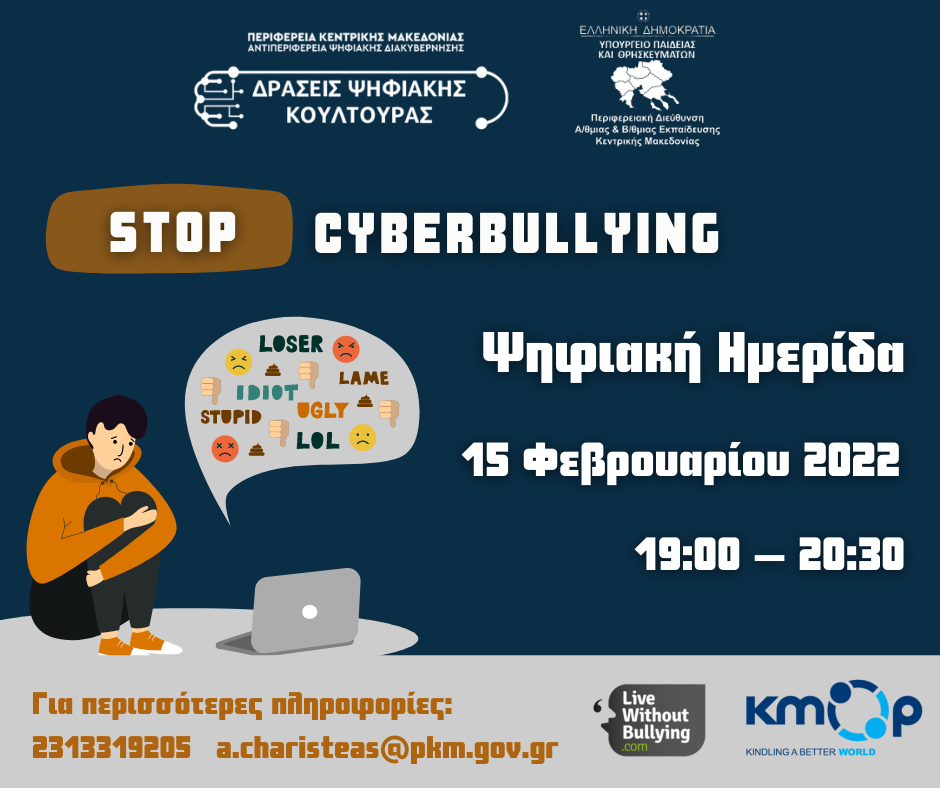 Η Περιφέρεια Κεντρικής Μακεδονίας και η Αντιπεριφέρεια Ψηφιακής Διακυβέρνησης στο πλαίσιο των Δράσεων Ψηφιακής Κουλτούρας διοργανώνουν την Τρίτη, 15 Φεβρουαρίου 2022 στις 19:00 την 3η Διαδικτυακή Ημερίδα, με θέμα «Stop Cyberbullying».