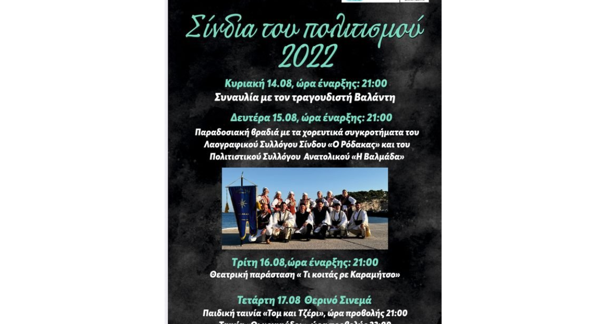 Ο Δήμος Δέλτα και ο Κοινωνικός Πολιτιστικός Οργανισμός, σας προσκαλούν παρευρεθείτε στις ετήσιες γιορτινές εκδηλώσεις, που διοργανώνει στην έδρα του Δήμου για τα “Σίνδια του πολιτισμού 2022“.