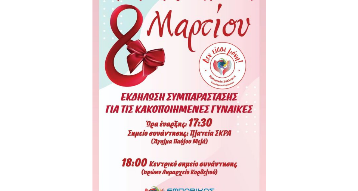 Με αφορμή την Παγκόσμια Ημέρα της Γυναίκας- Τρίτη 8 Μαρτίου 2022– ο Εμπορικός Σύλλογος Ελευθερίου Κορδελιού, οργανώνει συμβολική πορεία διαμαρτυρίας και Στήριξης σε κάθε γυναίκα θύμα έμφυλης βίας και προσκαλεί όλες τις Γυναίκες να συμμετέχουν και να ενώσουν την φωνή τους, στέλνοντας όλες μαζί , μηνύματα στήριξης και συμπαράστασης σε κάθε κακοποιημένη Γυναίκα που βιώνει την βία και «σιωπά» .Με αναμμένα κεριά, μπαλόνια, φαναράκια, σφυρίχτρες, πορτοκαλί κορδέλες (χρώμα σύμβολο στον αγώνα για την εξάλειψη της βίας κατά των γυναικών) και  με το σύνθημα «ΔΕΝ ΕΙΣΑΙ ΜΟΝΗ»,