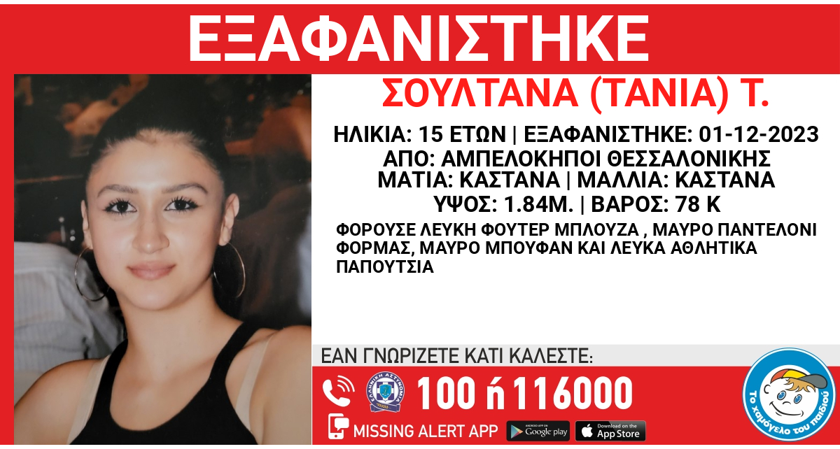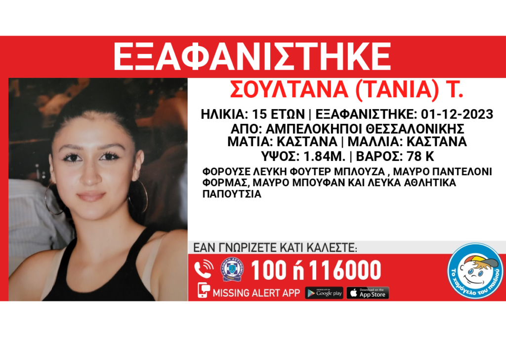 Στη 1/12/2023, πρωινές ώρες, εξαφανίστηκε από την περιοχή των Αμπελοκήπων Θεσσαλονίκης η Σουλτάνα (Τάνια) Τ. 15 ετών. «Το Χαμόγελο του Παιδιού» ενημερώθηκε για την εξαφάνιση της Κωνσταντίνας σήμερα 4/12/2023 και άμεσα προχώρησε στην δημοσιοποίηση των στοιχείων της ανήλικης, κατόπιν αιτήματος της οικογένειας της καθώς ενδέχεται να συντρέχουν λόγοι που θέτουν την ζωή της σε κίνδυνο.