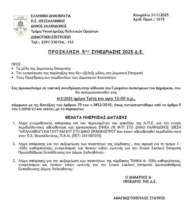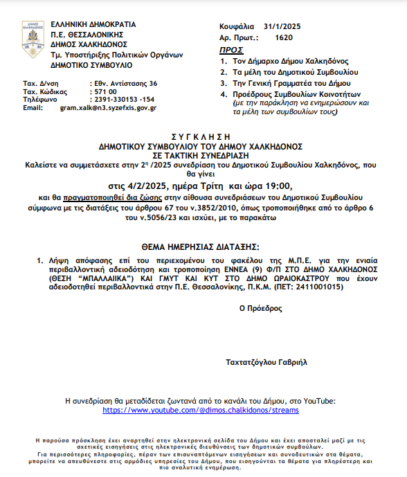 Την Τρίτη 04/02/25 θα πραγματοποιηθούν 2 συνεδριάσεις στο Δήμο Χαλκηδόνος.