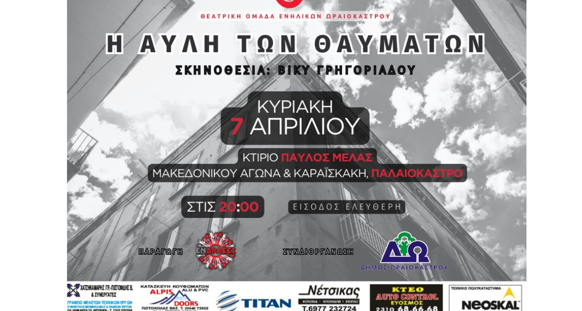 Δ. Ωραιοκάστρου, «Εν Δράσει» και «ΔιάΔραση» παρουσιάζουν την «Αυλή των Θαυμάτων» στο Ωραιόκαστρο Την παράσταση «Η Αυλή των Θαυμάτων» του Ιάκωβου Καμπανέλη παρουσιάζουν η Αντιδημαρχία Σύγχρονου Πολιτισμού, Εξωστρέφειας και Προστασίας των ζώων συντροφιάς και Φιλαρμονικής, ο Πολιτιστικός Σύλλογος «Εν Δράσει» και τα μέλη της Θεατρικής Ομάδας Ενηλίκων Ωραιοκάστρου «ΔιάΔραση» στο Ωραιόκαστρο. Η παράσταση θα παρουσιαστεί […]
