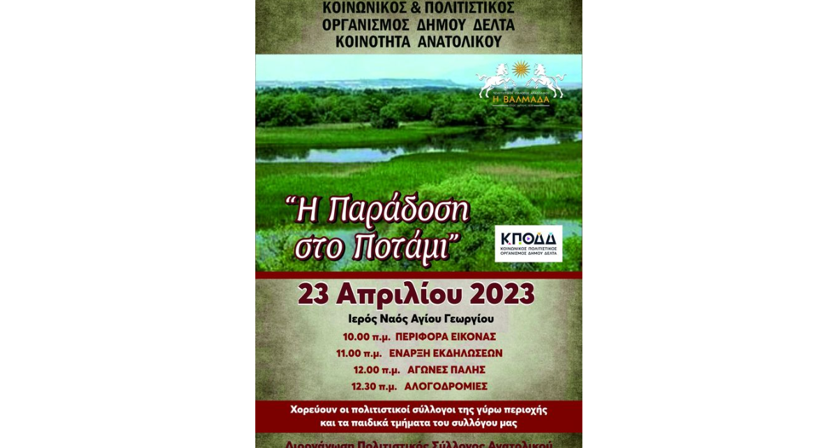 Σας καλούμε να παρευρεθείτε στην εκδήλωση “Η Παράδοση στο ποτάμι” που θα υλοποιηθεί στο Ανατολικό, προς τιμή του Αγίου Γεωργίου. διαβάστε επίσης: https://syndimotis.com/kalochoritika-2023-ekdiloseis-20-21-22-23-04-2023/ Ακολουθήστε το ΣυνΔΗΜΟΤΗ: ✅ στο Google News ➡ ✅ στο Facebook ➡ και μάθετε πρώτοι όλες τις ειδήσεις
