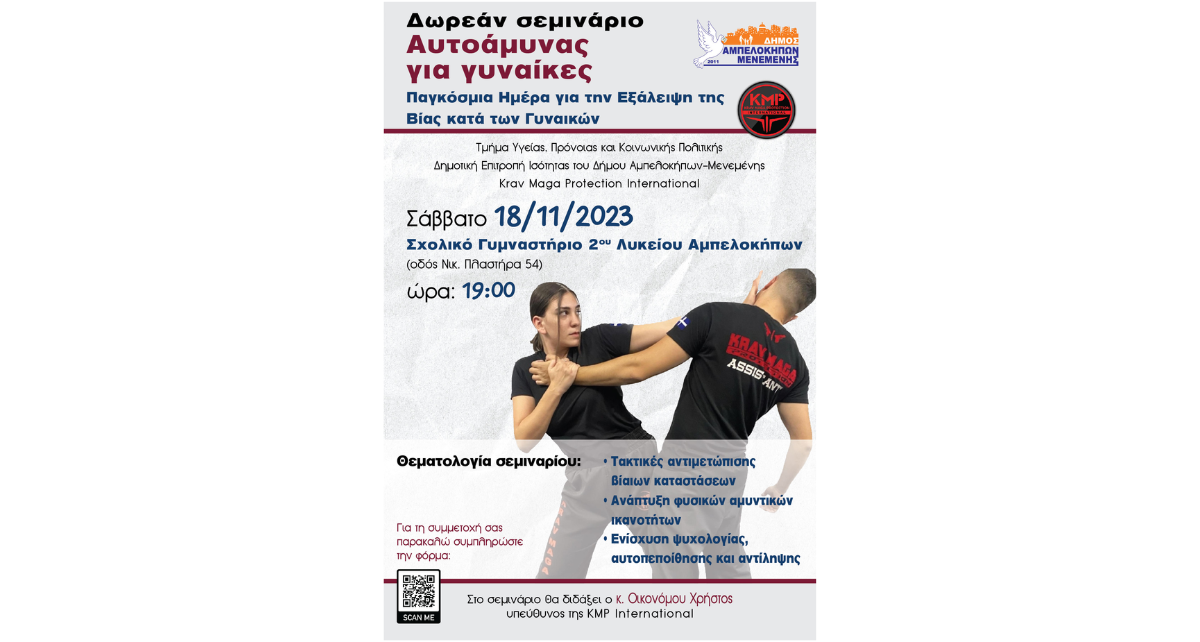 ΔΩΡΕΑΝ ΣΕΜΙΝΑΡΙΟ ΑΥΤΟΑΜΥΝΑΣ ΚΡΑΒ ΜΑΓΚΑ ΓΙΑ ΓΥΝΑΙΚΕΣ Το Τμήμα Υγείας, Πρόνοιας και Κοινωνικής Πολιτικής του Δήμου Αμπελοκήπων-Μενεμένης σε συνεργασία με τη Δημοτική Επιτροπή Ισότητας και την Krav Maga Protection International, πραγματοποιεί για δεύτερη χρονιά, δωρεάν σεμινάριο Αυτοάμυνας για γυναίκες το Σάββατο 18 Νοεμβρίου 2023 και ώρα 19:00 στο Σχολικό Γυμναστήριο 2ου Λυκείου Αμπελοκήπων (οδός Νικ. Πλαστήρα 54). […]