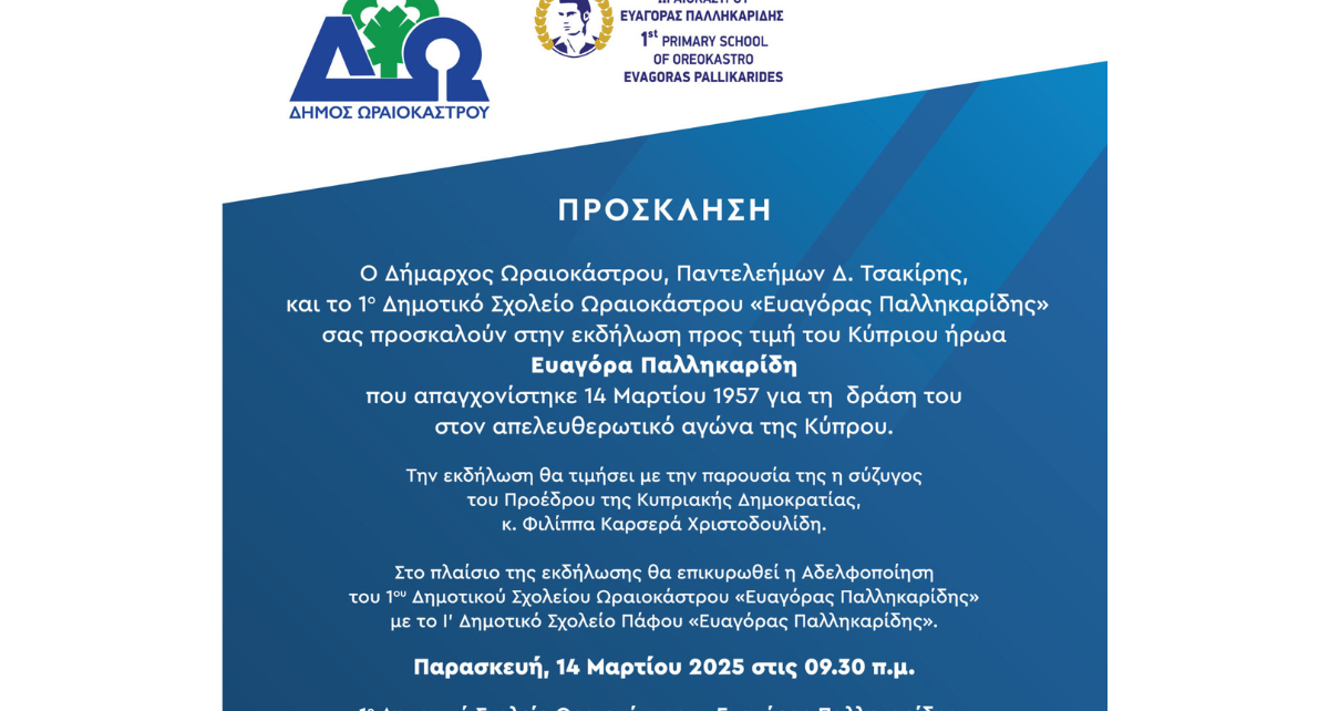 Θα παραστεί η σύζυγός του Προέδρου της Κυπριακής Δημοκρατίας, κ. Φιλίππα Καρσερά Χριστοδουλίδη Εκδήλωση προς τιμή του Κύπρου ήρωα, Ευαγόρα Παλληκαρίδη, που απαγχονίστηκε 14 Μαρτίου 1957 για τη δράση του στον απελευθερωτικό αγώνα της Κύπρου, συνδιοργανώνουν ο Δήμος Ωραιοκάστρου και το 1ο Δημοτικό Σχολείο Ωραιοκάστρου «Ευαγόρας Παλληκαρίδης». Η εκδήλωση θα πραγματοποιηθεί την Παρασκευή, 14 Μαρτίου […]