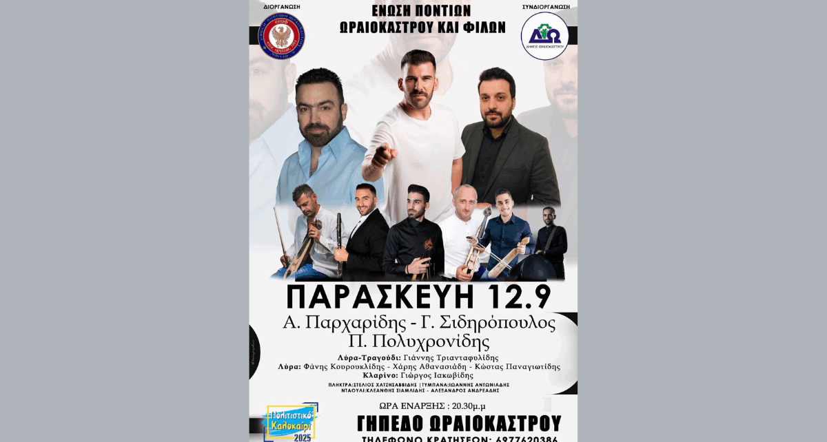 Πολιτιστικό Καλοκαίρι 2025 στο Ωραιόκαστρο Με ένα μεγάλο ποντιακό γλέντι συνεχίζεται το «Πολιτιστικό Καλοκαίρι 2025» του Δήμου Ωραιοκάστρου. Η εκδήλωση θα πραγματοποιηθεί την Παρασκευή, 12 Σεπτεμβρίου 2025, στις 8:30 το βράδυ, στο Γήπεδο Ποδοσφαίρου Ωραιοκάστρου. Η εκδήλωση και οι συνδιοργανωτές Το γλέντι συνδιοργανώνεται από τον Δήμο Ωραιοκάστρου και την Ένωση Ποντίων Ωραιοκάστρου και Φίλων (ΕΠΩΦ), […]