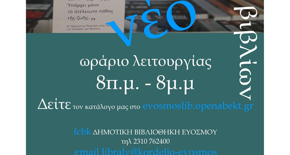 Σε ισχύ τίθεται από τη Δευτέρα 26 Αυγούστου το νέο ωράριο λειτουργίας της Δημοτικής Βιβλιοθήκης Ευόσμου. Πλέον, η Βιβλιοθήκη θα βρίσκεται στη διάθεση του κοινού από Δευτέρα έως και Παρασκευή, από τις 8:00 το πρωί έως τις 8:00 το βράδυ. Οι δημότισσες και οι δημότες του Δήμου Κορδελιού – Ευόσμου έχουν πρόσβαση σε 35.000 τίτλους […]