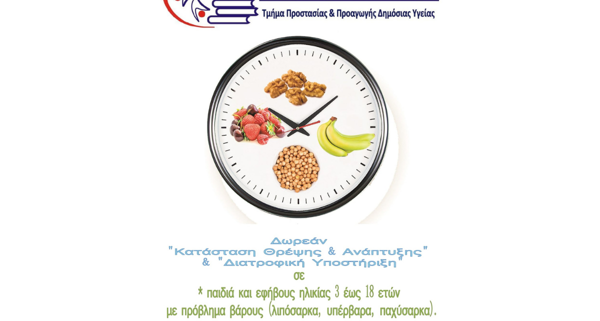 Ο Δήμος Θεσσαλονίκης και το Τμήμα Προστασίας και Προαγωγής της Δημόσιας Υγείας της Διεύθυνσης Κοινωνικής Προστασίας και Δημόσιας Υγείας, πραγματοποιεί εβδομαδιαία δράση ενημέρωσης για τη «Διατροφή και Υγεία», στο χώρο των Δημοτικών ιατρείων του Δήμου Θεσσαλονίκης στην Καραϊσκάκη 4 Τριανδρία, κατά το διάστημα 13/12/2021 εως 17/12/2021, καθημερινά από τις 09:00 έως τις 13:00.