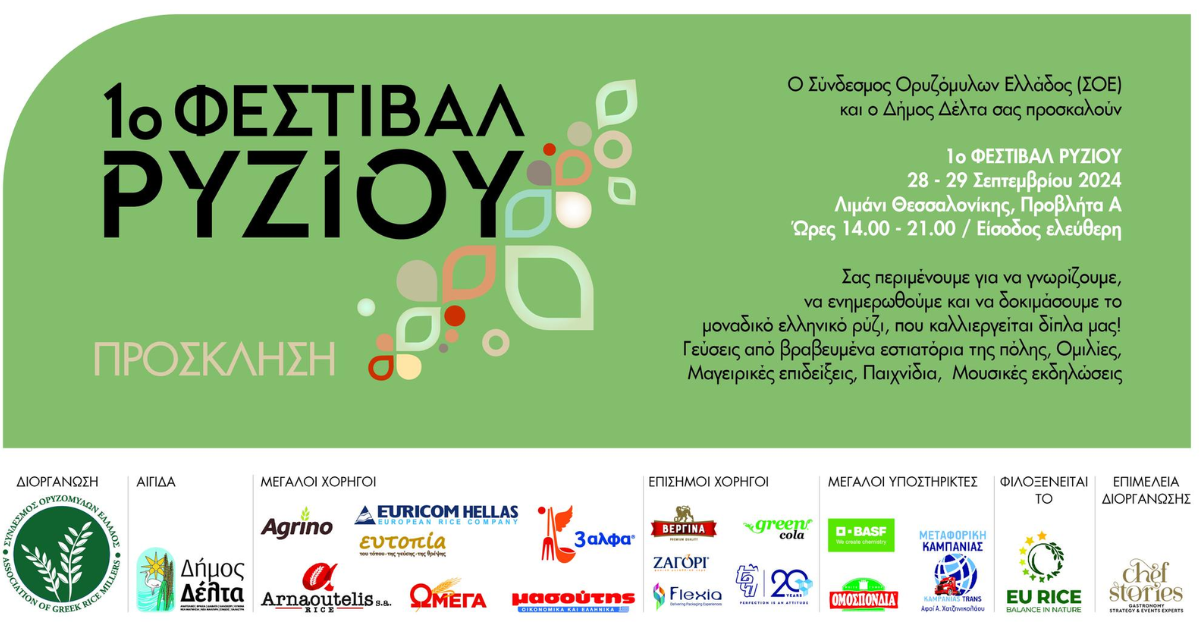 Σύμφωνα με ανάρτηση του Συνδέσμου Ορυζόμυλων Ελλάδος στα social, αναφέρεται: Το 1ο Φεστιβάλ Ρυζιού είναι γεγονός και έρχεται για πρώτη φορά στο Λιμάνι της Θεσσαλονίκης. Μια διοργάνωση του Συνδέσμου Ορυζόμυλων Ελλάδος (ΣΟΕ) και με την αιγίδα του Δήμου Δέλτα, για το νόστιμο, ασφαλές και με υψηλή διατροφική αξία ελληνικό ρύζι, που καλλιεργείται και παράγεται στην […]