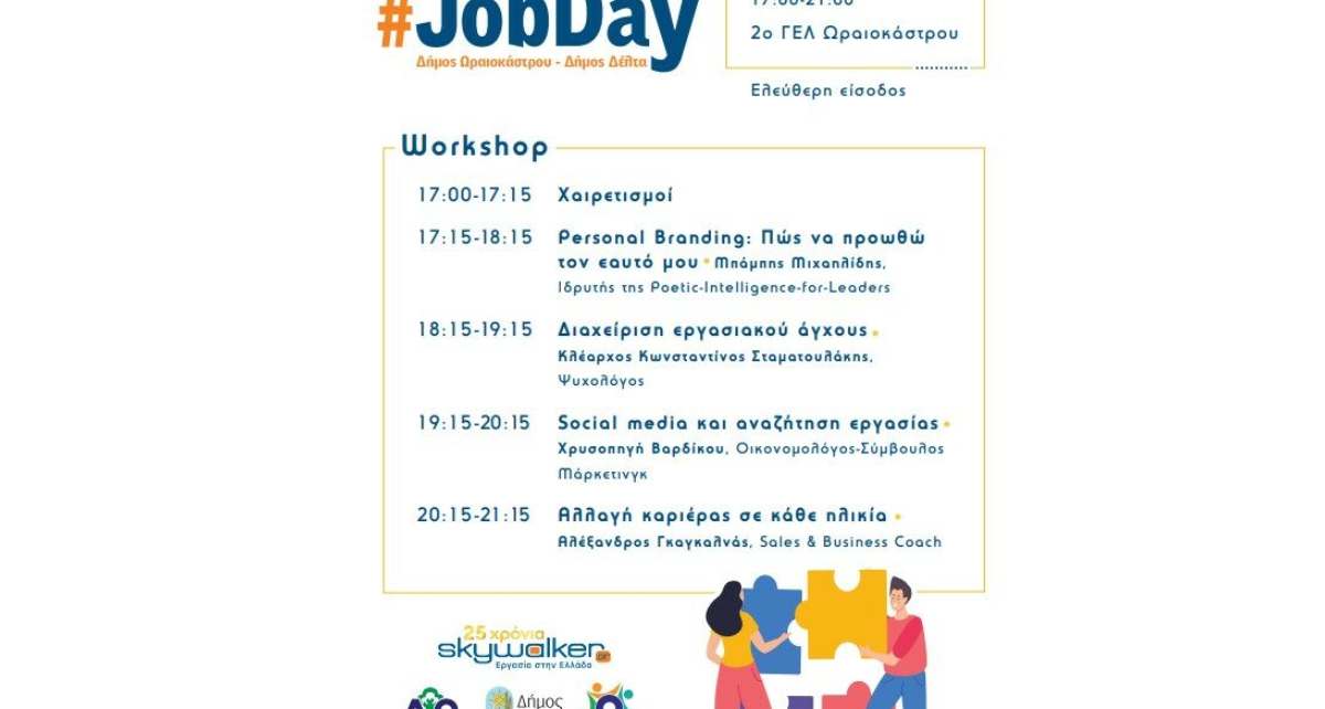 To skywalker.gr – Εργασία στην Ελλάδα, σε συνεργασία με τους Δήμους Ωραιοκάστρου και Δέλτα διοργανώνει το #JobDay Δήμων Ωραιοκάστρου-Δέλτα την Τετάρτη 17 Απριλίου 2024 στο 2ο ΓΕ.Λ. Ωραιοκάστρου και ώρες 17:00-21:00. Το #JobDay Δήμων Ωραιοκάστρου-Δέλτα απευθύνεται σε όποιον αναζητά εργασία ή σκέφτεται να αλλάξει επάγγελμα και θέλει να διευρύνει τις γνώσεις και τις δεξιότητές του […]