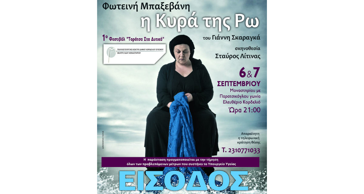 Με τη συγκλονιστική θεατρική παράσταση “Η Κυρά της Ρω” του Γιάννη Σκαραγκά σε σκηνοθεσία Σταύρου Λίτινα, που θα παρουσιαστεί τη Δευτέρα 6 και την Τρίτη 7 Σεπτεμβρίου στις 21:00 στο Πολυλειτουργικό Κέντρο του Δήμου Κορδελιού Ευόσμου “Θέατρο Οδού Μοναστηρίου” (οδός Παρατσίκογλου και Χρυσ. Σμύρνης γωνία, Ελευθέριο Κορδελιό – Είσοδος από Μοναστηρίου), ανοίγει η αυλαία του 1ου Φεστιβάλ “Ταράτσα στα Δυτικά” που διοργανώνει ο Δήμος Κορδελιού Ευόσμου δια της Αντιδημαρχίας Πολιτισμού.
