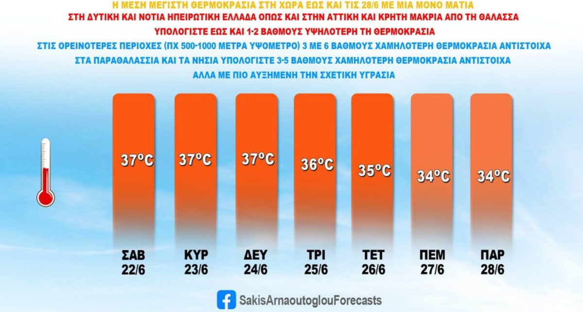 Σύμφωνα με ανάρτηση του Σάκη Αρναούτογλου στα social αναφέρει: “Η μέση μέγιστη θερμοκρασία στα πεδινά ηπειρωτικά έως τις 28 Ιουνίου με μια μόνο ματιά για να μη χάνετε τον…καιρό σας! Παρακαλώ κάντε κλικ στην εικόνα για μεγέθυνση και διαβάστε προσεκτικά την επεξήγηση για να υπολογίστε τη θερμοκρασία στην περιοχή σας καθώς αυτή θα διαφέρει από […]