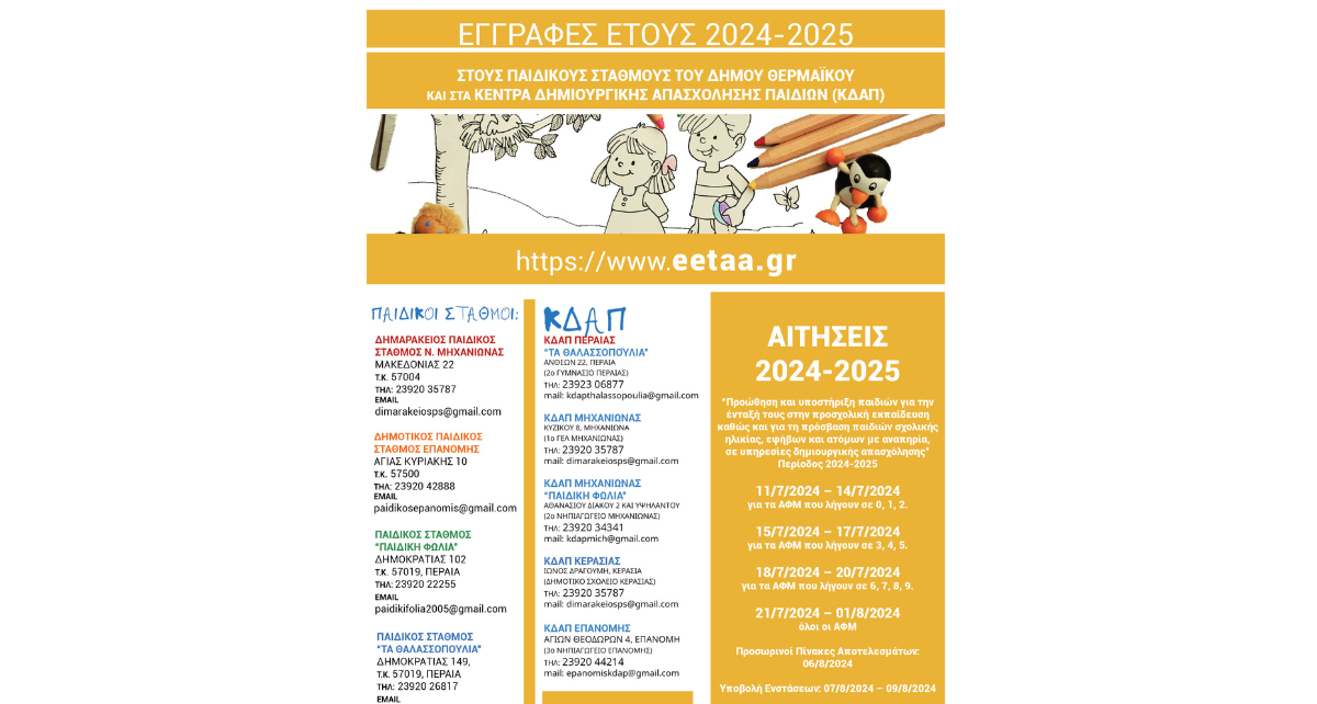 Η Διεύθυνση Προσχολικής Αγωγής του Δήμου Κορδελιού – Ευόσμου ανακοινώνει ότι οι δικαιούχοι voucher μπορούν από τη Δευτέρα 8 Σεπτεμβρίου στις 8.00 πμ, να προχωρήσουν στην υποβολή των αιτήσεων τους για την εγγραφή των παιδιών τους στους δημοτικούς Παιδικούς, Βρεφικούς, Βρεφονηπιακούς Σταθμούς και τα Δημοτικά ΚΔΑΠ. Η διαδικασία θα γίνεται αποκλειστικά ηλεκτρονικά, στην ψηφιακή πλατφόρμα του Δήμου Κορδελιού – Ευόσμου και στο […]